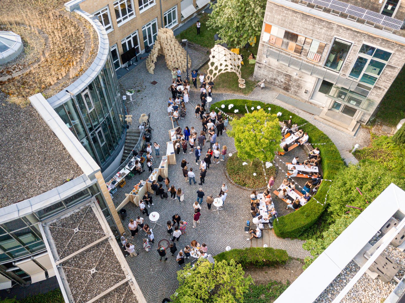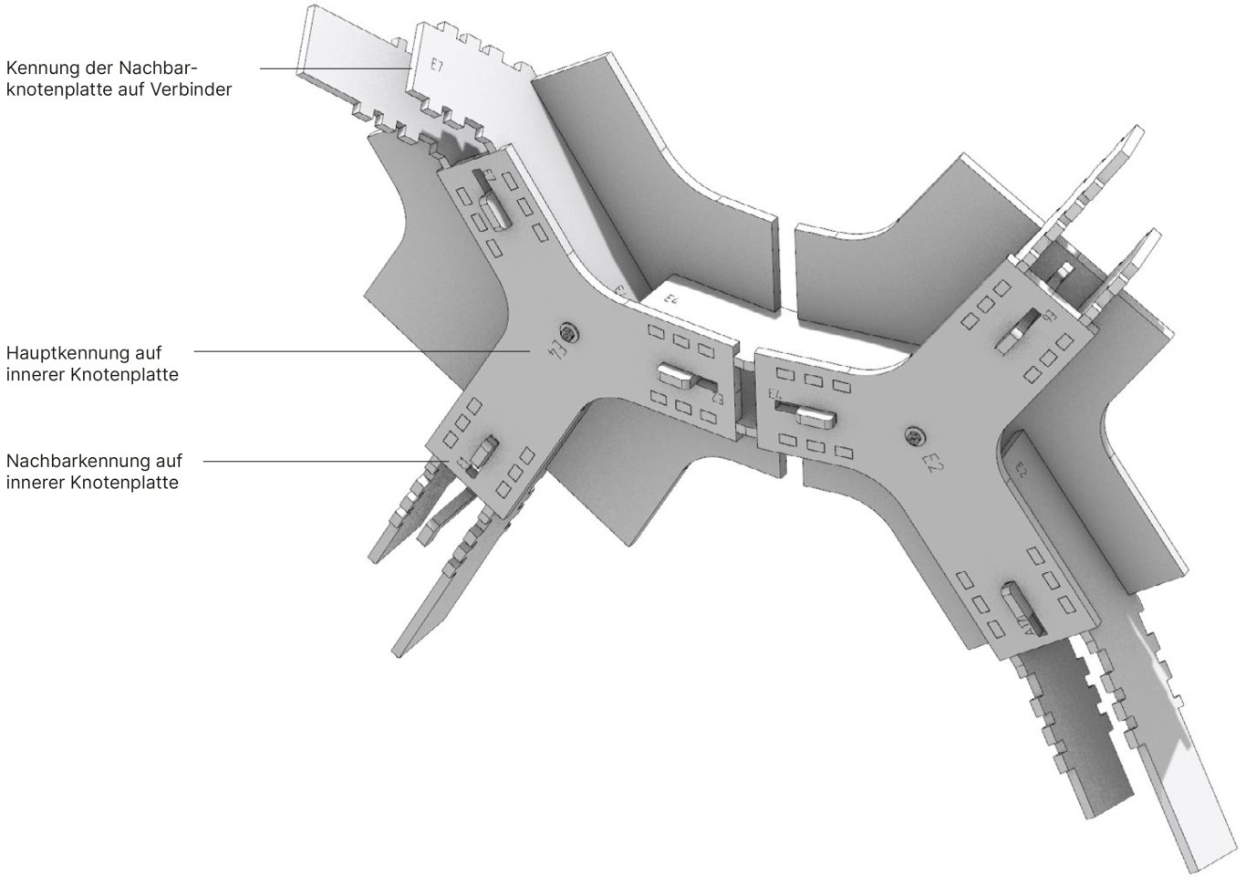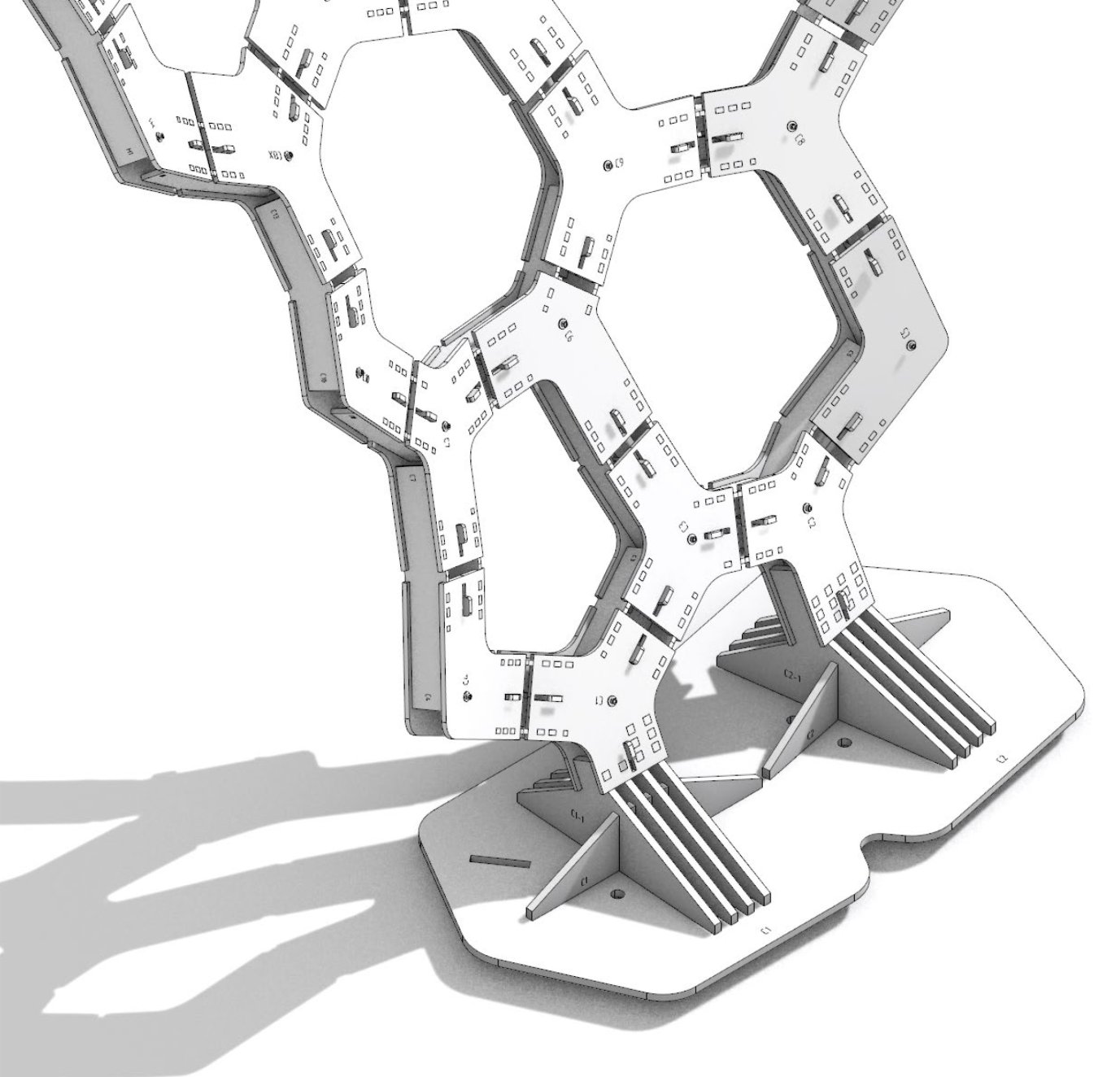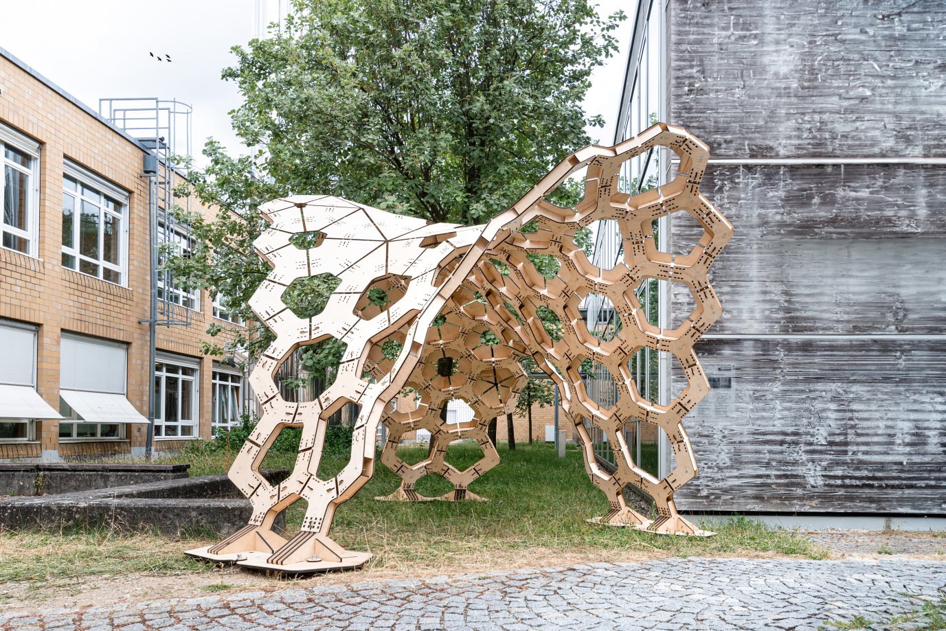Carapacks ist das Ergebnis eines Design-Build-Projekts, das über mehrere Semester an der Architekturfakultät der Hochschule Biberach stattfand. Das Team um Simon Vorhammer, Dr. Jonas Schikore, Dr. Christina Jeschke und David Ott entwickelte ein Konzept, um beliebig gekrümmte Freiformflächen als doppelschalige Stecksysteme umzusetzen. Die Besonderheit des hexagonalen Systems besteht darin, dass alle Teile krümmungs- und torsionsfrei sind und lotrechte Schnittkanten aufweisen. Dadurch ist eine effiziente und kostengünstige Fertigung mittels 2,5-achsiger CNC-Laser- oder Wasserstrahlschneidetechnik gewährleistet. Die Montage gestaltet sich unkompliziert und kann ohne den Einsatz schwerer Geräte und von versierten Laien durchgeführt werden. Die Bezeichnungen und Positionen sind in die Bauteile eingebettet. Dadurch können die geometrisch einzigartigen Platten mühelos und ohne die Notwendigkeit von Plänen zusammengesetzt werden – ähnlich wie bei einem Puzzle. Die Planarität erlaubt ein raumsparendes Stapeln. So passen zum Beispiel alle Einzelteile der im Folgenden gezeigten Konstruktionsstudie in die Kofferräume zweier Kombis. Das digitale parametrische Modell ermöglicht es, verschiedene Eingangsparameter wie Gesamtform, Geschlossenheitsgrad, Schalenstärke und Größe der Segmente zu definieren. Dadurch lassen sich nahezu instantan fertigungsreife Bausätze für unterschiedlichste Ausgangsgeometrien erzeugen. Zur Erprobung der Steckmechanik wurde im Sommer dieses Jahres ein Pavillon im Maßstab 1:1 aus 592 Holzelementen an der Hochschule errichtet. Nach einer Standzeit von etwa sechs Wochen wird dieser demontiert, um im nächsten Jahr an anderer Stelle auf dem Campus wieder aufgebaut zu werden. Das System ist nicht auf Holzpavillons beschränkt, sondern könnte auch auf Überdachungen und Fassaden übertragen werden. Die Materialbeständigkeit kann durch die Wahl von Holz für den Außenbereich oder die Verwendung anderer wetterfester plattenförmiger Materialien sowie Holzbehandlungen gewährleistet werden. Regendichtigkeit könnte durch eine zusätzliche, außen liegende, transparente Hülle, zum Beispiel aus ETFE, hergestellt werden.