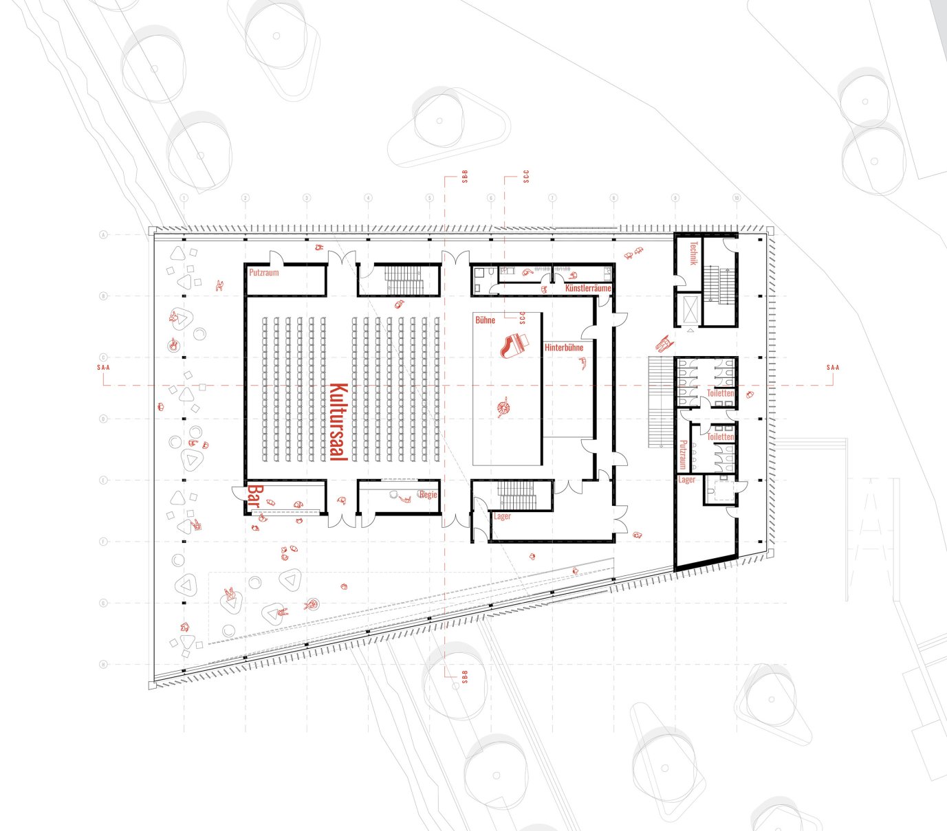 Die Entwurfsaufgabe bestand darin, am zentralen Isarufer von Bad Tölz eine neue architektonische räumliche Setzung zu erarbeiten, ein Kulturhaus. Am Rande des Altstadtkerns - am Isarkai - sollte ein neuer kultureller Schwerpunkt erzeugt werden: neue Aufenthaltsqualitäten, neue Außen- wie Innen-Räume für Einheimische und Besucher von Bad Tölz sollten geschaffen werden. Zentrale Elemente des Entwurfs sind ein Kultursaal , insbesondere auch für junge alternative Kultur- und Unterhaltungsangebote sowie ein kleiner Veranstaltungssaal mit gemeinsamem Foyer, Lounge, Gastronomie.