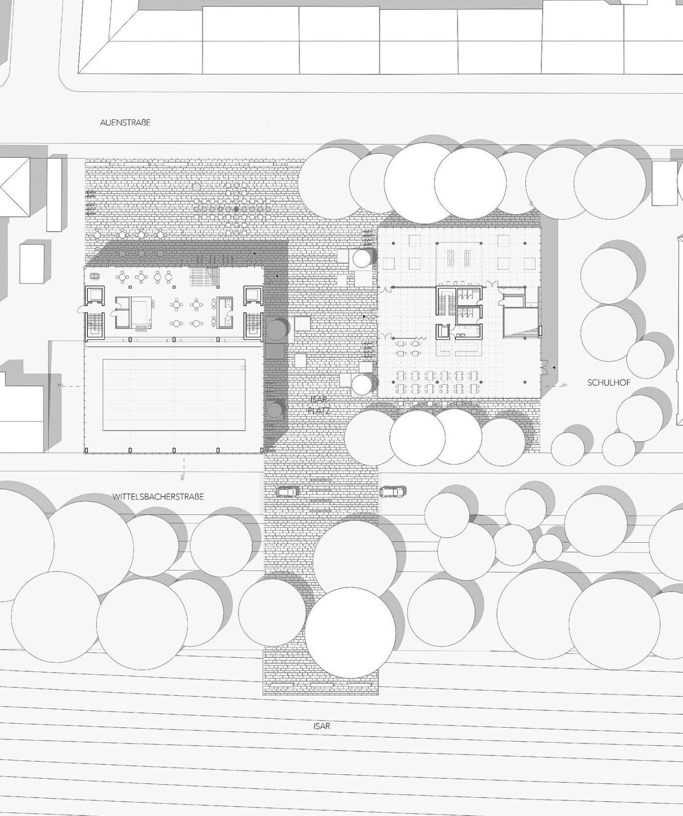 Zwei große städtische Grundstücke in München direkt an der Isar-Tangente, angrenzende an die Wittelsbacherschule werden mit einem neuen urbanen Multi-Use-Sport-/ Schul-und Kinderzentrum bebaut. Das Zentrum soll durch Kinder/ Schüler, Vereine aber auch die Bewohner des angrenzdenden Viertel und der näheren Umgebung genutzt werden können. Gleichzeitig soll die Rolle der entstehenden Außenräume für das Glockenbachviertel mit bedacht werden. Funktionale Kernelemente sind eine Schwimmhalle, eine Einfach- oder Zweifach-Sporthalle, ein Kindergarten sowie Erweiterungsräume für die Schule.