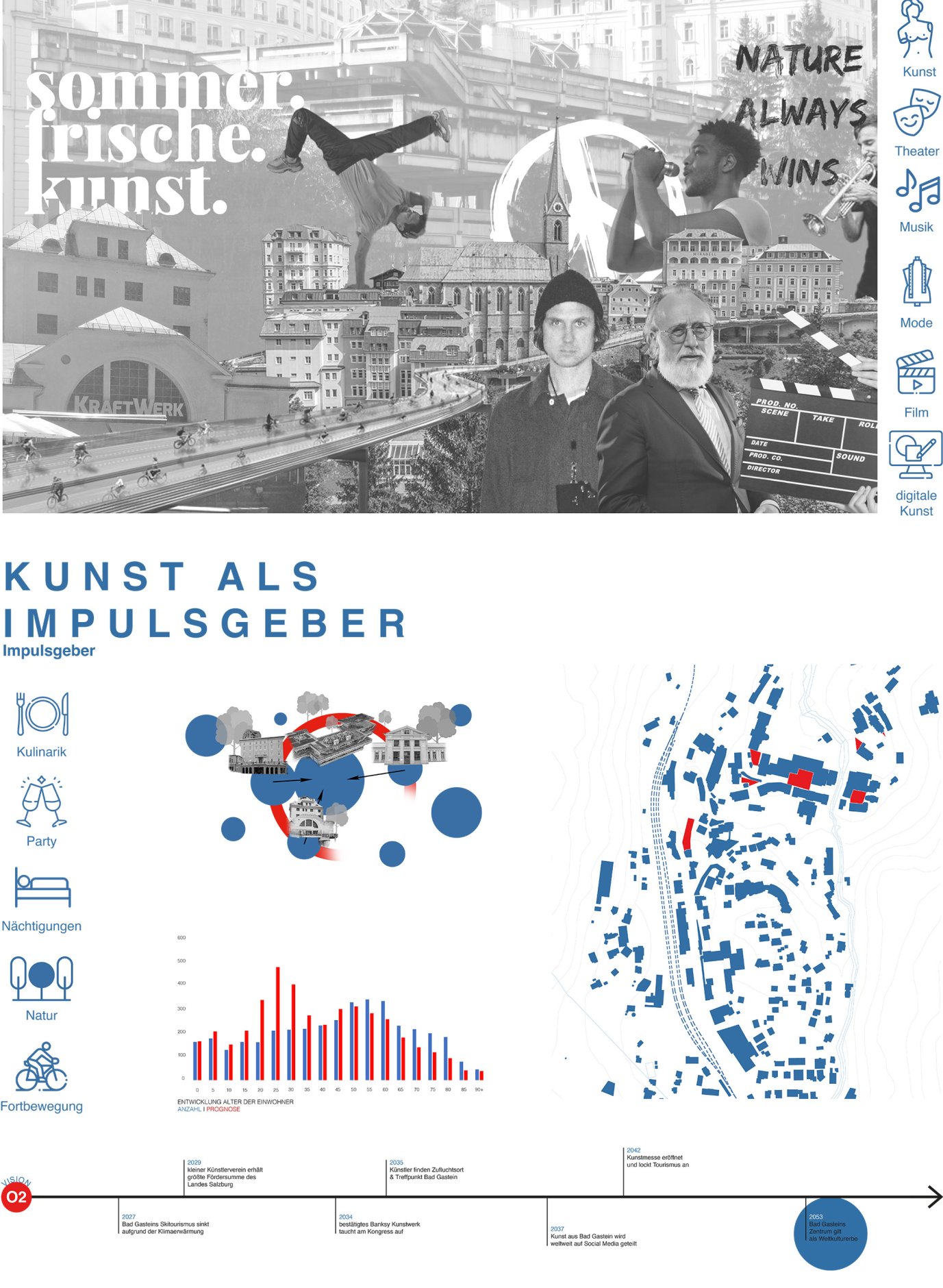 Die Arbeit baut auf profunde vielseitige Recherche und leitet daraus visionäre aber plausible Zukunftsideen für den Kur- und Wintersportort Bad Gastein ab. Sie nähert sich dem Charakter der kleine morbid glamourösen Stadt inmitten der Alpen damit behutsam an und schreibt die Eigenarten des Standortes fort.